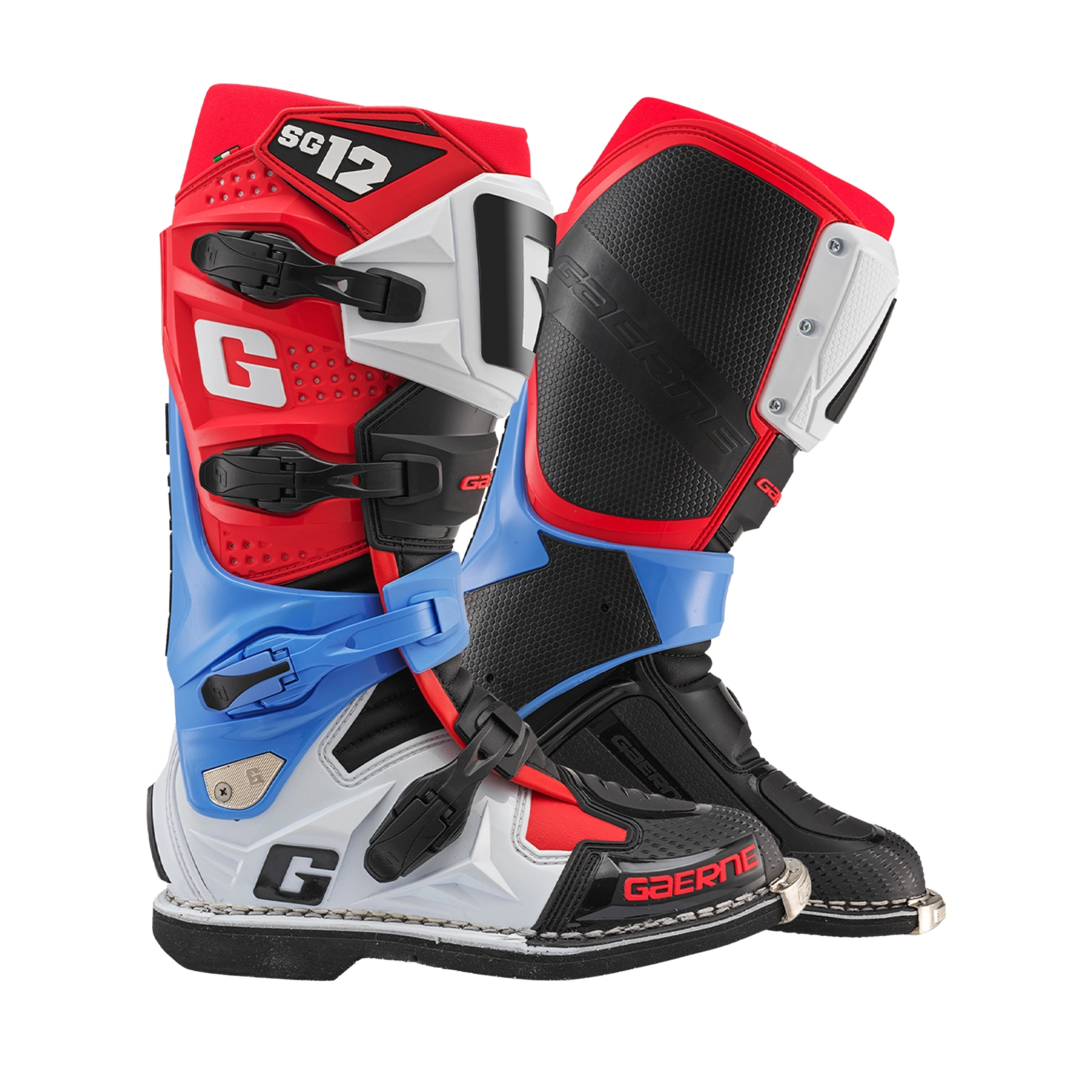 Las botas SG12 Realm enduro Guatemala de Gaerne combinan tecnología de competencia con un diseño visualmente impactante. Con su combinación tricolor de rojo, azul y blanco, este modelo destaca tanto en las pistas como en los senderos más técnicos de enduro.
